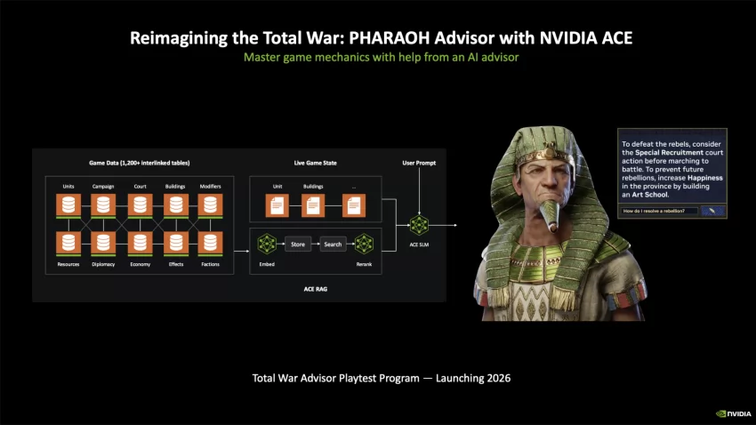Ad esempio, su Total War: PHARAOH questa tecnologia è stata utilizzata per animare il nostro consigliere personale per muovere i primi passi nel gioco. Sfruttando modelli linguistici di piccole dimensioni eseguiti in locale sul PC, l’assistente può fornire suggerimenti contestuali con maggiore profondità rispetto ai classici tutorial scriptati.