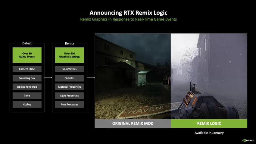 RTX Remix è un altro tassello molto apprezzato dalla community, in particolar modo dai modder. Per questo, NVIDIA ha annunciato RTX Remix Logic, una nuova funzionalità che consente di ottenere effetti visivi dinamici senza dover riscrivere il codice di base del gioco stesso.