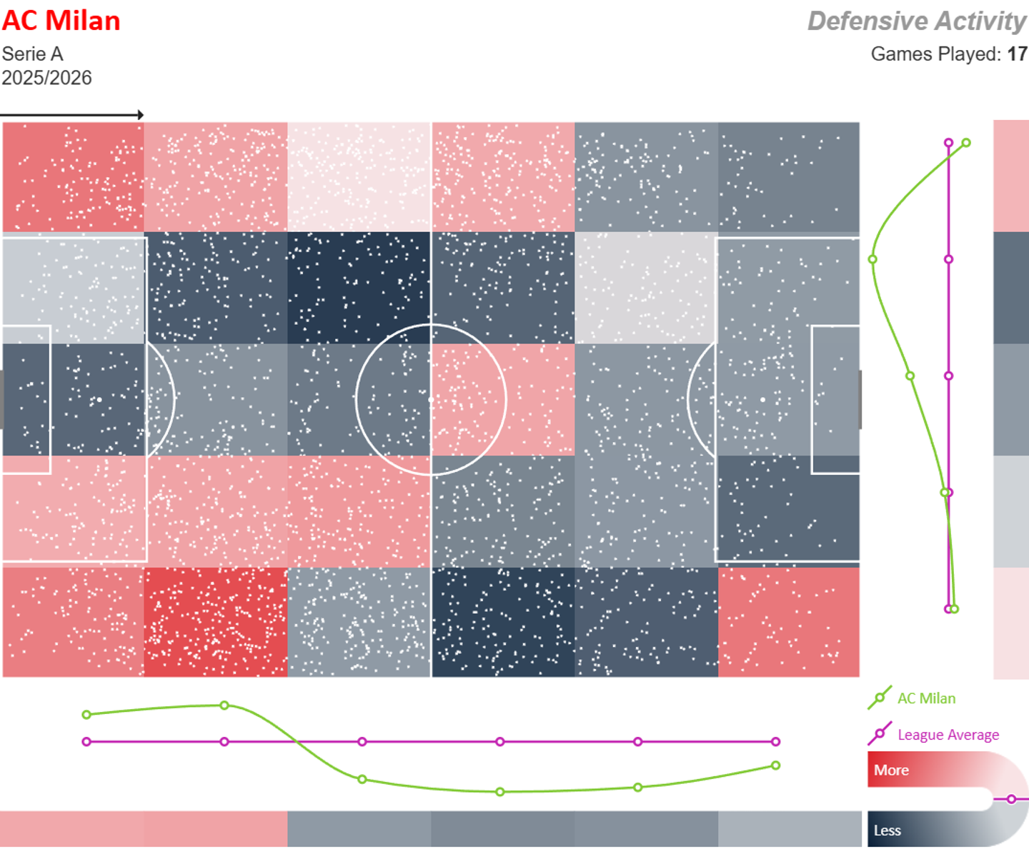 Il PPDA è il numero di passaggi che si concedono in media all’avversario prima di compiere un tackle, un intercetto o un’azione difensiva più in generale, è il dato più interessante per il pressing. Il Milan in questa metrica è ultimissimo, solo la Lazio che gli si avvicina. La squadra di Allegri preferisce spesso adottare un blocco medio-basso per vari motivi: per non esporre troppo i suoi difensori, per restringere il campo da coprire a Modric, per semplice ideologia calcistica. Statsbomb permette di rappresentare questo atteggiamento molto bene con il grafico che segue.