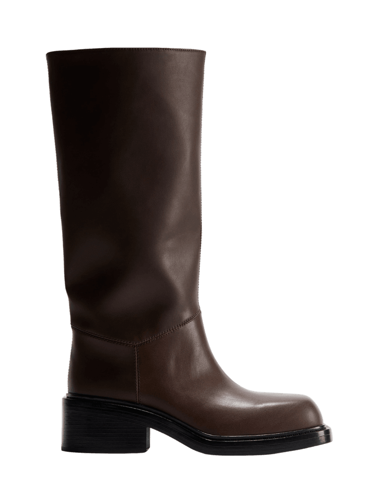 Completavano il look stivali marroni a punta squadrata con tacco largo, una delle chaussures più forti e versatili della stagione, capaci, con la nuance profonda ma morbida, di dare carattere al più semplice degli outfit e qui di infondere una nota urban ai codici bon ton del look.