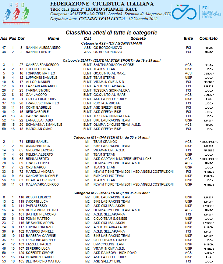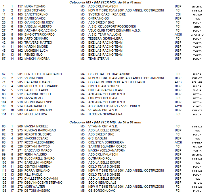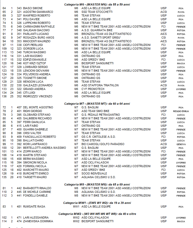 Corsa velocissima fin da subito la prima batteria di gara con le categorie Elite Sport, M1 M2 M3, insieme anche agli ex agonisti ma anche quella dei più “vecchietti” che rientra subito fin dal primo giro sulla corsa degli M4, M5 ricompattandosi in un unic gruppo. Nella prima batteria di gara è TIZIANO MURA, M3 della Cicli Falaschi a fare l’assoluto sorprendendo i più giovani extraregionali, MANUEL SENNI del Team Crainox che si aggiudica i Master M1 e FRANCESCO CANEPA, Elite Sport della Santini Squadra Corse, quarto posto a Luca Toffolo Team Stefan e quinto Matteo Foppiano del Gc Quinto al Mare. Vince la categoria Master M2, Federico Rossi della Bike Lab Racing Team. Nella ormai gara, diventata seconda batteria, è MICHELE MASSA, categoria M5 del Vitam-In Cycling Team, che si aggiudica la vittoria assoluta su RAIMONDAS RUMSAS de La Belle Equipe, mentre terzo sarà GIUSEPPE PIEROTTI della Speedy Bike, quarto posto per Cesare Macchi della Gs Baglini, mentre dietro, regola il gruppo e vince la categoria M6, SIMONE BIASCI de La belle Equipe, che avrebbe fatto l’assoluto della terza partenza, su Gianmarco Agostini della Ssd Stocchetti. E’ Giancarlo Bertellotti del Gs Pedale Pietrasantino a aggiudicarsi la categoria M4, mentre Del Monte Agostino della Gs Baglini vincerà la categoria M7, a Rinaldo Barabotti della New Mt Bike Team la vittoria in categoria M8, prima donna assoluta e di categoria MW1, RUMSAITE RASA de La Belle Equipe su LARI ALESSANDRA Cicli Falaschi che si aggiudica la categoria MW2 su ZANIEWSKA DOMINICA del Bicisport Sanguinetti. Tra gli ASS al via, 1° e 2° la famiglia NANNINI con ALESSANDRO e LAERTE.