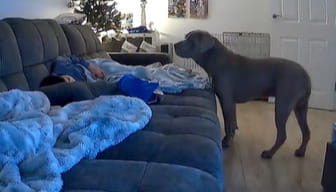 La pet cam ha registrato il momento in cui Bear entra nella stanza dove i bambini riposano sul divano. Si ferma davanti a loro, annusa, si muove con delicatezza e resta accanto per qualche minuto, quasi a sorvegliarli. Una volta sicuro che stiano bene, si allontana senza disturbare, lasciando trasparire tutto il suo istinto protettivo.