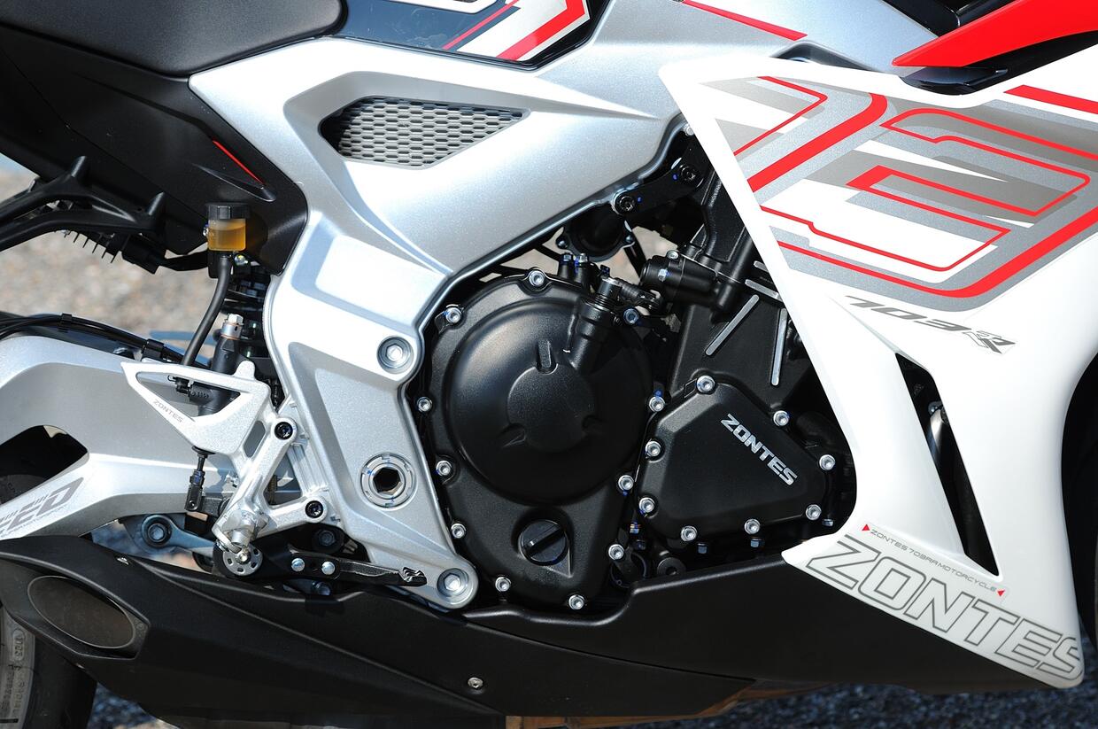Progettato e costruito da Zontes, il tre cilindri in linea di 699 cm³ con distribuzione bialbero, raffreddamento a liquido e cambio a sei marce offre una potenza massima di 95 CV a 11.500 giri/min, con un picco di coppia di 74,4 Nm a 8.500 giri. Propulsore che funge da elemento strutturale all’interno della ciclistica: iI telaio è un’unità a doppio trave in alluminio pressofuso, abbinato a un forcellone bibraccio realizzato anch’esso in alluminio.
