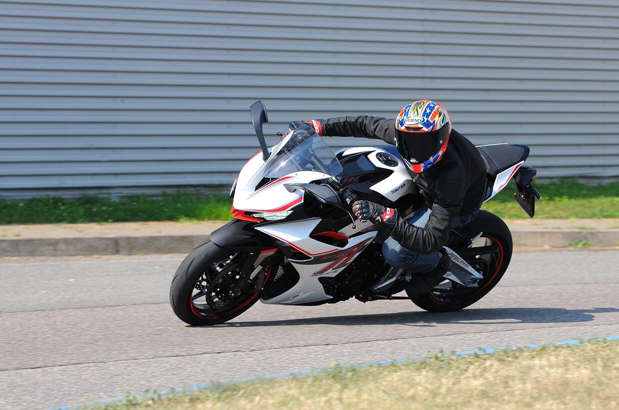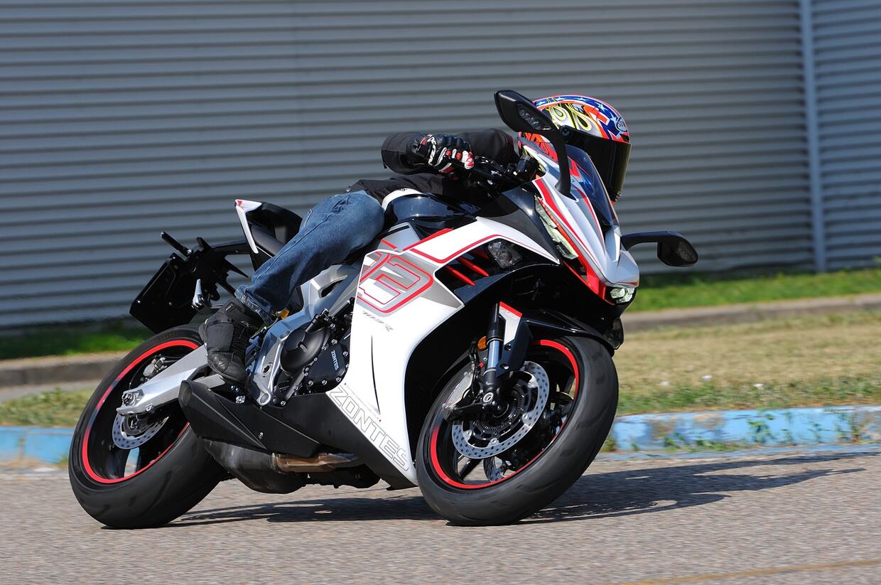 La Zontes 703 RR è una sportiva vera e lo fa intendere non solo dall’estetica affilatissima, ma anche dalla posizione di guida molto caricata sui polsi, con i semimanubri abbastanza larghi che infondono un buon feeling con la ruota anteriore. Le pedane sono alte e anche piuttosto arretrate, costringendo i più alti a piegarle significativamente. Chi supera i 180 cm di statura si troverà infatti un po’ stretto, per via delle dimensioni compatte della moto. Per la guida sportiva, però, l’ergonomia è perfetta: il peso caricato sull’avantreno permette di avere sempre un ottimo controllo e le gomme Michelin Power GP2 sono ideali anche tra i cordoli.