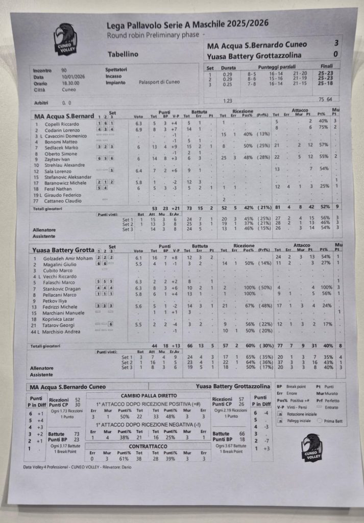 Benzina nel serbatoio e, quindi, tanta fiducia grazie ad una prova di squadra ed arricchita dal prezioso supporto dalla panchina, a partire da Lorenzo Sala, meritatamente MVP. Top scorer un ottimo Sedlacek (14 punti), in crescita anche Zaytsev a quota 13. Ma il tempo per festeggiare resta poco: mercoledì 14 gennaio (ore 20.30) si torna sul taraflex di San Rocco Castagnaretta dove arriverà Perugia.