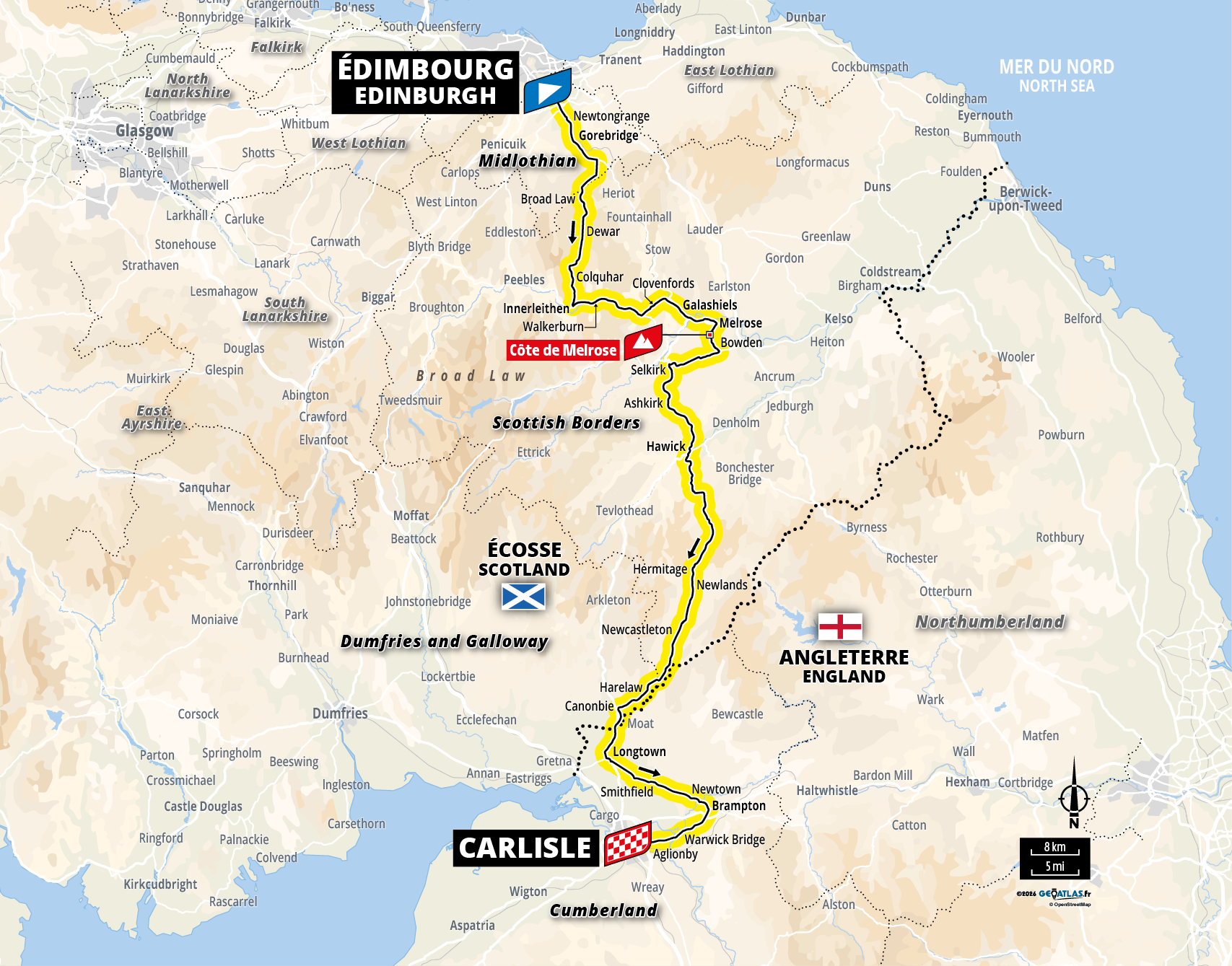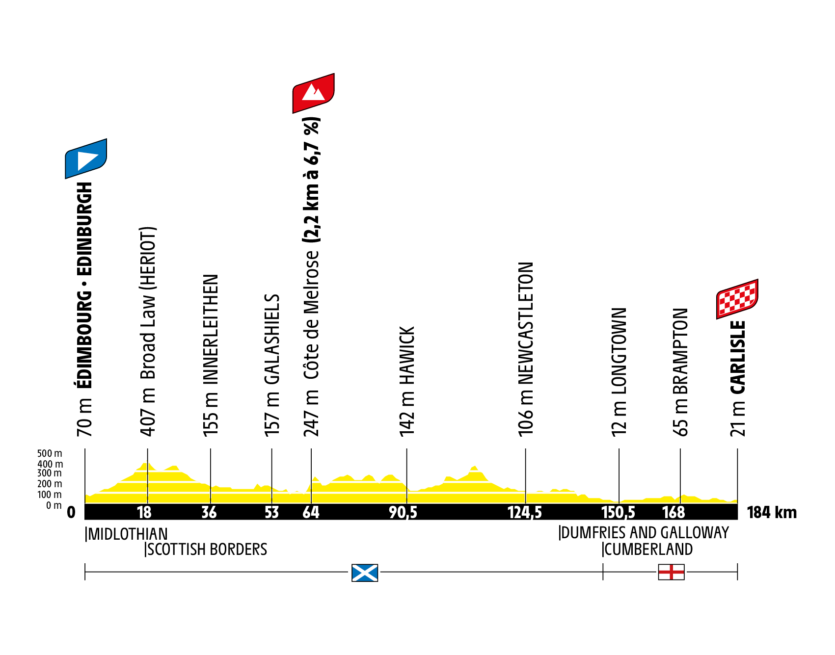 Come detto, il Tour de France 2027 prenderà il via da Edimburgo, con una frazione di 184 km verso Carlisle. La prima frazione sarà quasi interamente pianeggiante: l’unico GPM è posto al km 64, ma la Côte de Melrose, con i suoi 2,2 km al 6,7%, non sembra destinata a fare grande selezione. Dopo i primi 145 km in terra scozzese, il gruppo entrerà in Inghilterra per avvicinarsi a Carlisle, dove realisticamente uno sprint assegnerà la prima maglia gialla dell’edizione.