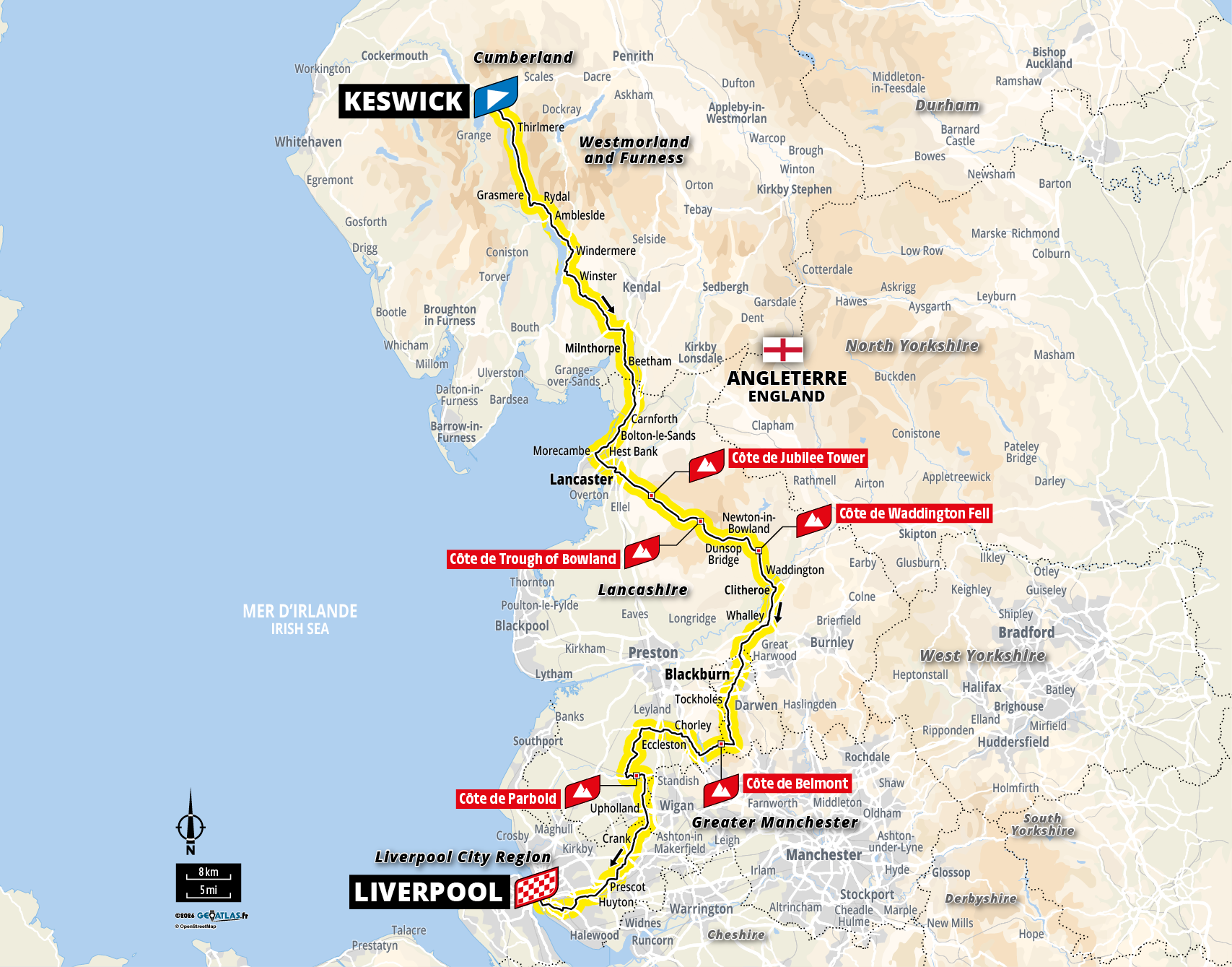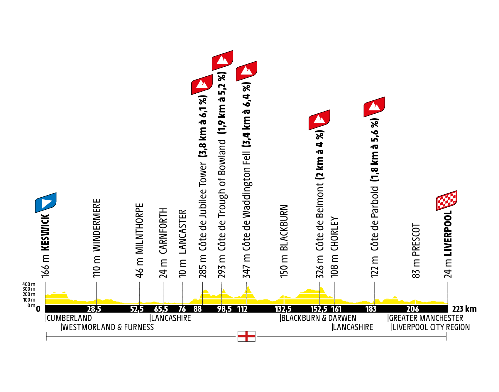Lo scenario non dovrebbe cambiare in maniera significativa nella seconda tappa del Tour de France 2027, da Keswick Liverpool. È vero che i 223 km in programma sono disseminati di GPM, per un dislivello positivo complessivo di 2800 metri, ma si tratta di salite brevi per lo più posizionate nella prima metà della giornata. L’ultima asperità, la Côte de Parbold, misura 1800 metri con una pendenza media del 5,6% e si trova a 40 km dal traguardo: la combinazione non dovrebbe permettere azioni decisive e il plotone, a meno di sorprese, dovrebbe essere in grado di controllare la situazione verso un’altra volata, stavolta in quel di Liverpool.