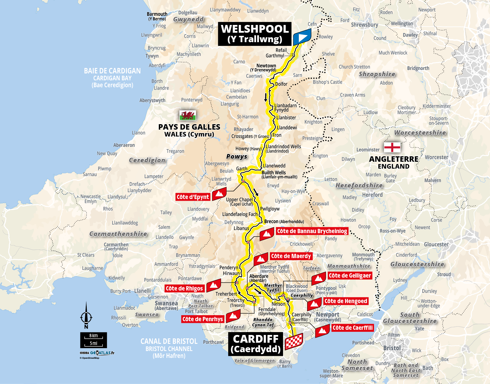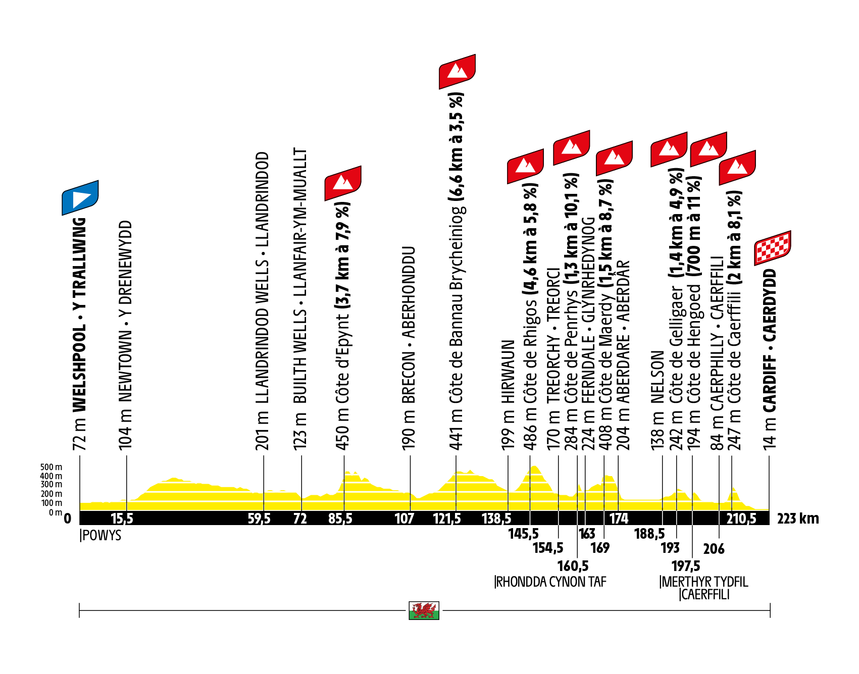 Il primo giorno che potrebbe dire qualcosa in termini di classifica generale è allora la terza tappa del Tour de France 2027, che si correrà interamente in territorio gallese con partenza a Welshpool e arrivo a Cardiff, su un percorso di 223 km. L’arrivo nella capitale gallese è costellato da côte, tanto che la giornata prevede 8 GPM totali e un dislivello positivo di 3000 metri. Nello specifico, il tratto decisivo inizierà con il passaggio da Nelson, previsto a 35 km dalla conclusione. Dopo quel punto, i corridori affronteranno in rapida successione la Côte de Gelligaer (1,4 km al 4,9%), la Côte de Hengoed (700 metri all’11%) e la Côte de Caerffili (2 km all’8,1%). Quest’ultima, che per lunghezza, difficoltà e distanza dal traguardo sarà probabilmente determinante, finisce ad appena 12,5 chilometri dal traguardo di Cardiff e può essere il trampolino di lancio verso la vittoria e, chissà, una nuova maglia gialla.