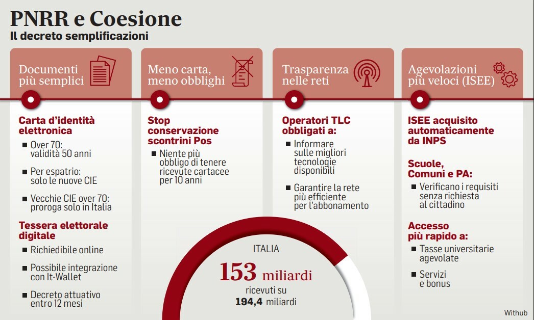 L’attuazione del Piano nazionale di ripresa e resilienza e le politiche di coesione diventano il mezzo per facilitare la vita ai cittadini e alle famiglie. Passano infatti da un prossimo decreto per accelerare l’ultima fase del Pnrr e gli investimenti legati ai fondi di Coesione, l’introduzione di una serie di semplificazioni che spaziano dal rinnovo della carta d’identità elettronica alla richiesta della carta d’identità elettronica.