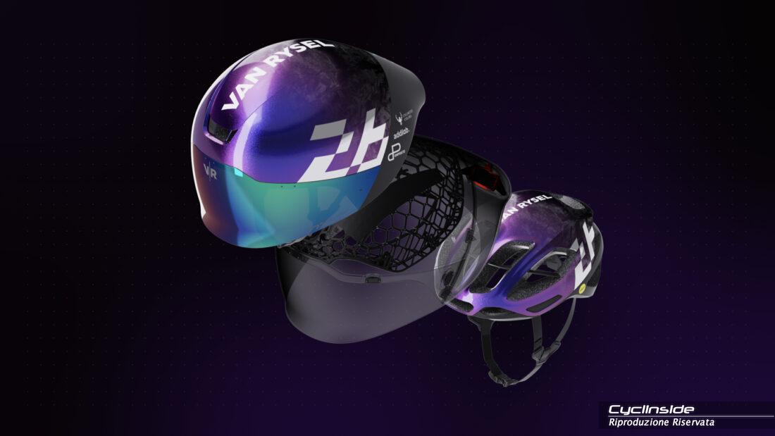 – il casco è un casco ibrido: combina una base conforme a normative attuali di sicurezza con una calotta aerodinamica in carbonio personalizzata, sviluppata in collaborazione con Swiss Side, che si aggancia direttamente al casco.