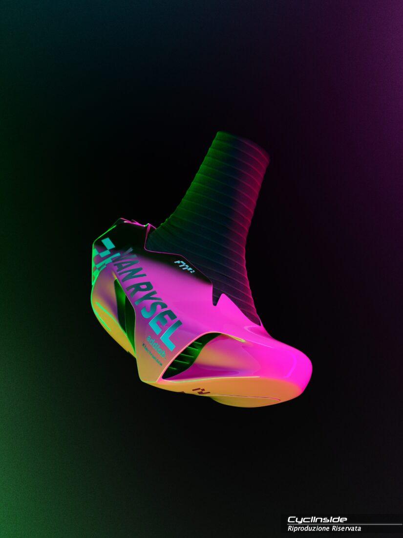 – la scarpa reinventa l’interfaccia bici-ciclista, eliminando i tradizionali sistemi di fissaggio e i pedali a sgancio, pur essendo controllabile in modalità wireless dal cockpit. È un altro esercizio tecnico teso a garantire ulteriore sicurezza e a migliorare l’aerodinamica, eliminando tutti i tradizionali elementi meccanici dalla classica tomaia.