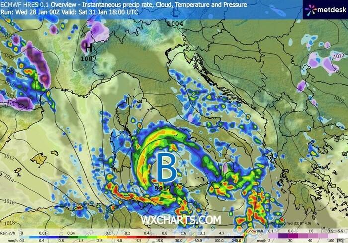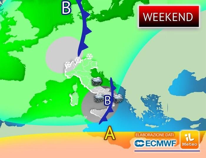 Centro-Nord: situazione più stabile per le regioni settentrionali e centrali, che beneficeranno di ampie aperture soleggiate, pur in un contesto termico tipicamente invernale. Da segnalare solo qualche fiocco di neve sulle Alpi occidentali, oltre i 600 metri.Passaggio del ciclone (indicato con la lettera “B) nel corso di Sabato 31 GennaioDomenica 1 Febbraio: la sorpresa del miglioramento