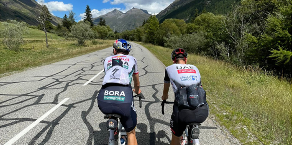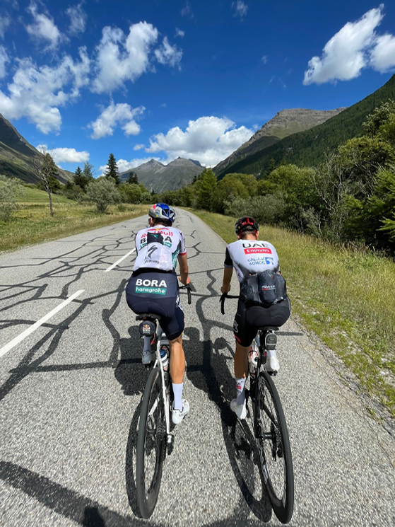 Ci troviamo bene, abbiamo preso una casa in affitto e ci gestiamo noi la routine. Non avendo la squadra dietro abbiamo maggiore libertà sugli orari e i percorsi ma manca la parte del supporto tecnico. Senza l’ammiraglia ci si arrangia e se fa troppo freddo per fare la discesa verso valle in bici la facciamo in macchina e partiamo più in basso.