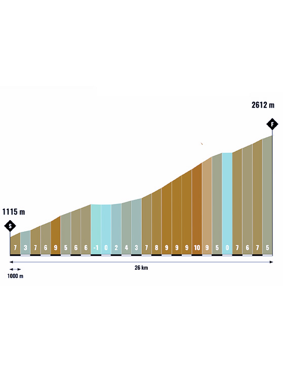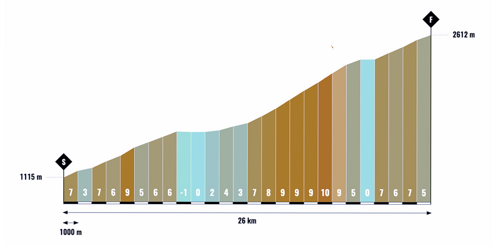 La salita inizia di fatto a Noasca con due strappi secchi. «Il primo – racconta Ellena – va su al 15 per cento, poi c’è un tratto più dolce e di nuovo un altro muro durissimo. Dopo circa 9 chilometri si entra a Ceresole Reale e la strada sale regolare. Seguono 3 chilometri quasi pianeggianti lungo il lago di Ceresole. Poi ecco una rampa verso il Serrù con pendenze al 7-8 per cento, un breve tratto in discesa ed infine gli ultimi 5-6 chilometri verso il Nivolet. Questo tratto è abbastanza regolare, sul 7 per cento, ma è duro visto che si va sopra quota 2.200 metri. L’altitudine comincia a farsi sentire tanto che si scollina a 2.612 metri».