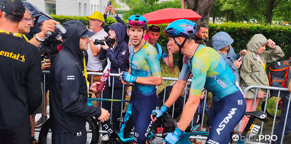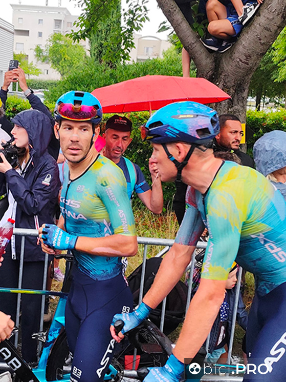 Milan indossa un giubbino verde pesante e il berretto di lana della squadra. Il clima fuori è decisamente autunnale e se domani sulle Alpi ci sarà la stessa acqua, per i corridori si prospettano giorni tosti.