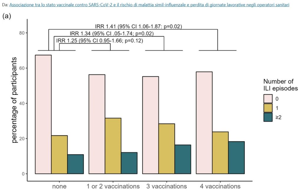 “In entrambe le analisi, dimostriamo che un maggior numero di vaccinazioni contro il SARS-CoV-2 è associato a un rischio maggiore di malattie respiratorie simil-influenzali e di giornate lavorative perse. […] Sulla base dei nostri dati, concludiamo che la vaccinazione di richiamo contro il SARS-CoV-2 non contribuisce alla protezione del personale sanitario in un contesto post-pandemico. La vaccinazione contro il SARS-CoV-2 può persino aumentare temporaneamente la probabilità di infezione sintomatica e di perdita di giornate lavorative.”