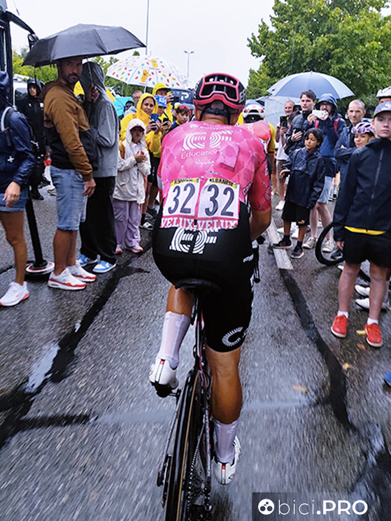 VALENCE (Francia) – Quando sfila sotto il diluvio universale, tra le persone e i bambini che cercano una borraccia, Vincenzo Albanese ha appena la forza per dirci: «Non ora, fa troppo freddo». E scappa verso il bus della EF Education-EasyPost, fermo circa 200 metri più avanti (in apertura foto ASO / Charly Lopez).