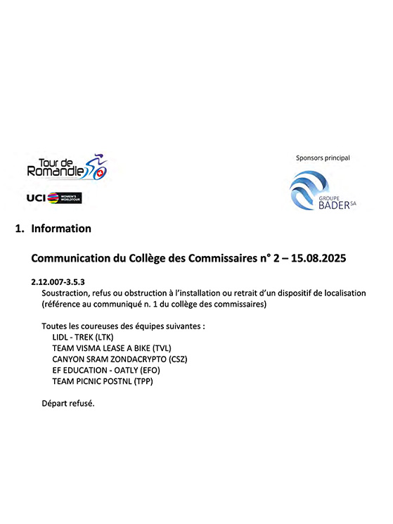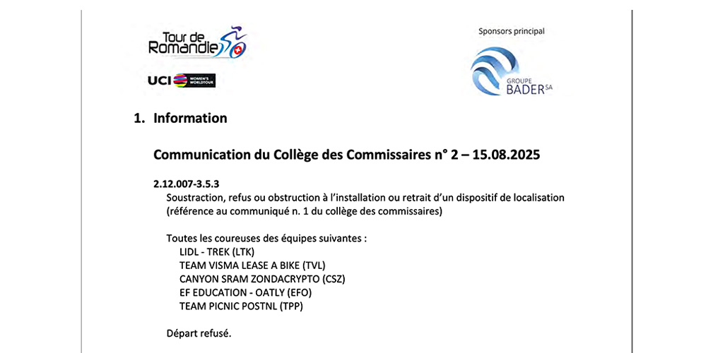«(…) Le squadre erano tenute a designare una ciclista sulla cui bicicletta sarebbe stato installato il localizzatore GPS. Le squadre hanno ricevuto ulteriori spiegazioni durante la riunione dei Direttori Sportivi pre-evento. L’UCI si rammarica che alcune squadre si siano opposte al test non nominando una ciclista che indossasse il dispositivo di tracciamento e abbiano quindi optato per l’esclusione dal Tour de Romandie Féminin. Alla luce di questa situazione, l’UCI valuterà se siano necessarie altre misure in conformità con il Regolamento UCI».