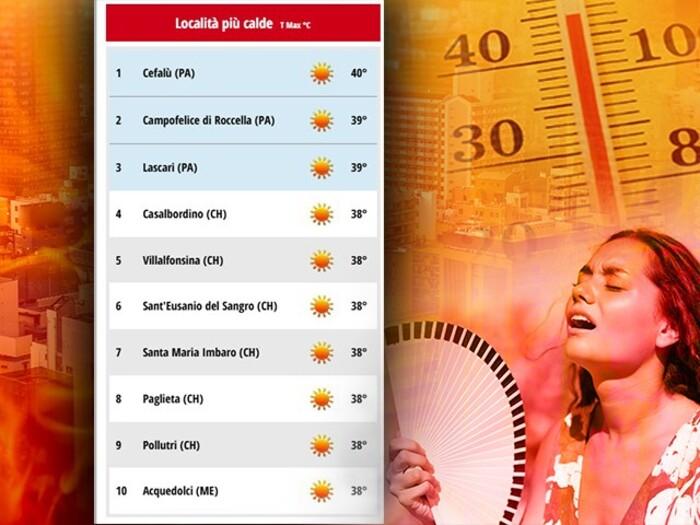 Le località più calde nei prossimi giorniCi sarà invece una fetta del Paese dove le temperature si manterranno decisamente più basse: il Nord, soprattutto, ma anche alcuni tratti del versante tirrenico del Centro, zone che saranno insidiate dal maltempo, il quale contribuirà ovviamente a spegnere gli ardori dei venti africani, costretti a rimanere confinati più a sud per via delle più performanti ed instabili correnti atlantiche.