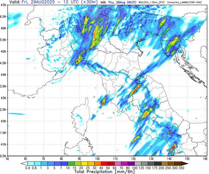 Nel corso di Venerdì 29 Agosto il ciclone investirà in pieno le regioni del Centro Sud: secondo gli ultimi aggiornamenti a maggior rischio temporali (serio rischio di nubifragi) saranno: Toscana, Lazio e Campania. Tra pomeriggio e sera arriverà una seconda passata temporalesca che colpirà nuovamente il Nord con temporali; visto l’ingresso di aria fresca ed instabile in quota non escludiamo la possibilità di grandinate. Da segnalare infine le fortissime raffiche di Libeccio lungo le coste di Liguria e Toscana.