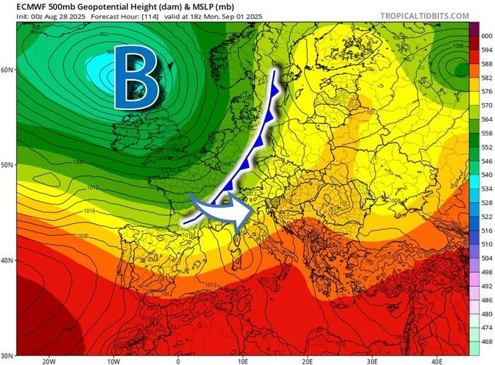La prossima settimana inizierà nel segno del maltempo: nel corso di Lunedì 1 e Martedì 2 Settembre una prima e forte perturbazione di origine atlantica investirà in pieno le nostre regioni centro-settentrionali. Proprio a causa della rapidità con cui avverrà l’irruzione e della tanta energia in gioco (mari molto caldi, correnti da Sud richiamate dal ciclone), potrebbero venirsi a creare le condizioni ideali per lo sviluppo di nubifragi e grandinate. Massima attenzione andrà prestata in particolare su Piemonte, Lombardia, Veneto, Friuli Venezia Giulia nonché su Liguria di Levante/Toscana e Lazio dove non escludiamo il rischio di allagamenti.