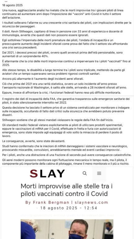 Diverse condivisioni Facebook stanno rilanciando una fake news di Slay, sito noto per la pubblicazione sistematica di notizie false o fuorvianti ai fini del clickbait. Stavolta l’argomento riguarda il presunto collegamento tra le morti improvvise dei giovani piloti di linea e i vaccini Covid. Una narrazione volta ad attirare i lettori No vax. Chi firma l’articolo originale, Frank Bergman, è un autore a noi già noto per la produzione prolifica di bufale.