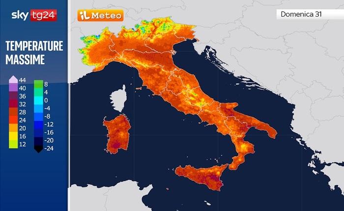 Le temperature massime previste per Domenica 31 Agosto 2025DOMENICA POMERIGGIO TORNANO LE NUBI