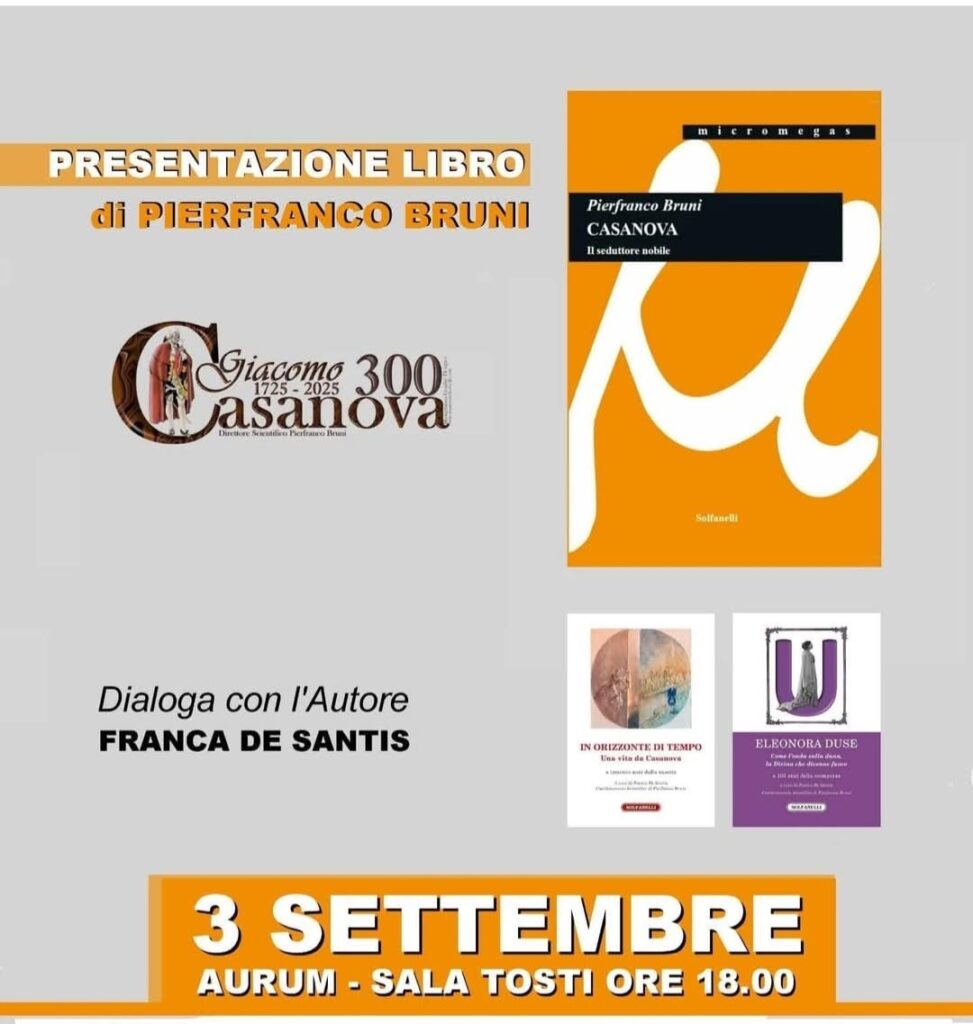 Il 3 settembre 2025, all’Aurum di Pescara, Pierfranco Bruni presenta il suo libro Casanova. Il seduttore nobile (Solfanelli).
