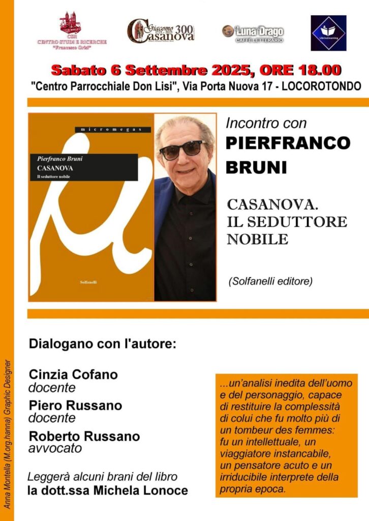 Sabato 6 settembre alle ore 18.00 al Centro Parrocchiale “Don Lisi” di Locorotondo Pierfranco Bruni presenta il suo libro “Casanova il seduttore nobile”, Solfanelli Editore.