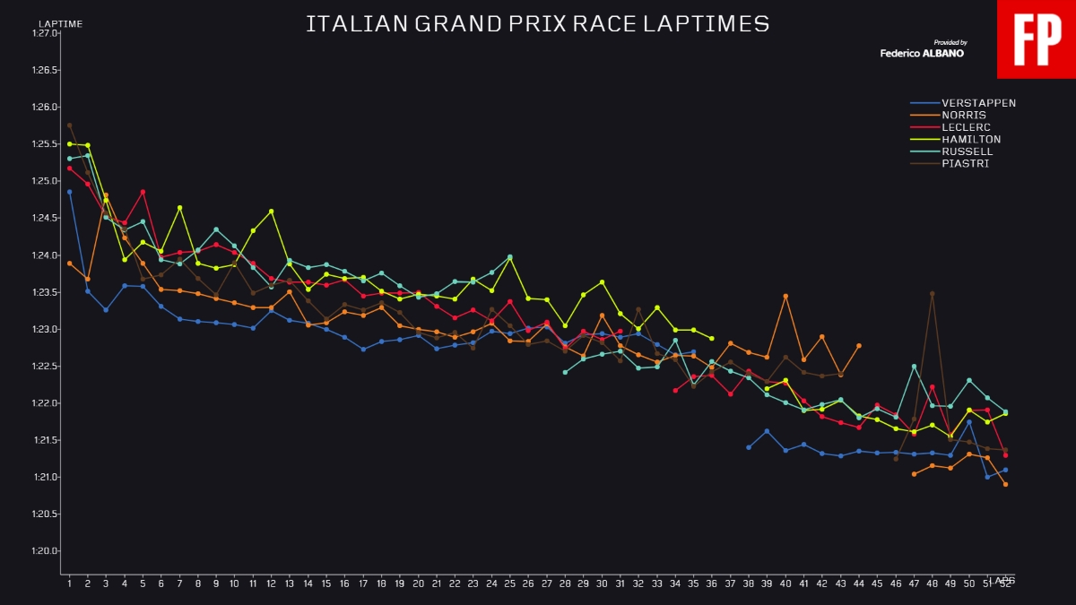 In tutto ciò la “notizia” può essere che la McLaren non fosse questo weekend la miglior vettura in pista, ma non c’è da meravigliarsi troppo in negativo, anzi. Andrea Stella scherzando dopo la gara ha detto che Monza per la MCL39 è una pista dura perché ci sono poche curve e non possiamo che dargli ragione. Abbiamo visto chiaramente che c’è un limite entro cui gli uomini del team papaya possono spingersi a scaricare la vettura senza finire in zone di pessima efficienza complessiva o di sbilancio aerodinamico, e per questo Norris e Piastri erano i due piloti alla fine con più carico sulla monoposto in valore assoluto. Quello che stupisce in realtà è positivo per loro e negativo per la concorrenza: la quantità di tempo guadagnata mediamente dai piloti McLaren nel secondo e nel terzo settore della pista, dalla prima di Lesmo alla Parabolica, era notevolmente superiore alla perdita in rettilineo per mancanza di velocità di punta. Alla vigilia si supponeva anche che il vantaggio McLaren sarebbe stato sul passo gara, sfruttando un’usura inferiore degli pneumatici, ma le mescole Pirelli si sono dimostrate decisamente di durezza eccessiva, con un degrado quasi nullo ed una gara che si poteva percorrere tranquillamente quasi per tutti addirittura con la gomma media (senza scomodare neppure la hard). Monza è una pista ormai dai cordoli piatti, che quindi non mettono in difficoltà il sistema sospensivo né pongono dubbi sulle altezze da terra, con appena 6 curve e poi solo infiniti rettilinei, in un’era in cui le differenze di potenze dei motori sono esigue ed in una gara dove la gestione gomma non ha praticamente fatto alcuna differenza, dato che appunto il degrado e l’usura sono risultati praticamente nulli, e soltanto una vettura (nemmeno un team intero) è riuscita ad arrivare davanti a Norris e Piastri. Se non è imbarazzante (per gli altri) questo, non sappiamo cosa possa esserlo. C’è un teorico fattore di imbarazzo anche in casa McLaren, con il pit stop lungo di Norris che ha poi causato l’ordine di scuderia che ha invertito le posizioni restituendo all’inglese il secondo posto. Pubblico e addetti ai lavori, tra cui i piloti stessi, si dividono sul fatto che la manovra sia stata effettivamente giusta oppure “troppo corretta e noiosa” in qualche modo, in un mondo che dovrebbe essere di “racing spietato”. Su questo però chi scrive non concorda, ritenendo che in fin dei conti l’errore al pit stop era stato puramente della squadra e rimettere le cose a posto è, come ha detto Piastri in conferenza stampa, un modo anche di proteggere i membri del team ed i meccanici, oltre che ridare a Norris ciò che gli spettava. Peraltro, una volta data gara libera dopo il sorpasso, Lando ha confermato quello che si era visto nella prima parte di gara, ossia di avere leggermente più passo di Piastri, circa un decimo e mezzo, e al di là di quanto scelte del genere piacciano o meno, l’ordine di arrivo ha rispecchiato i valori in pista. Sui piloti c’è infine da sottolineare la battaglia di Piastri con Leclerc a inizio gara: l’australiano ha mostrato un gran coraggio nell’attaccare la Ferrari numero 16 all’esterno della prima di Lesmo. Sebbene forte della importante disparità di carico aerodinamico, Piastri si gioca il mondiale ed in quella situazione il confine tra il gran sorpasso ed un contatto con il conseguente 0 in classifica era particolarmente sottile.