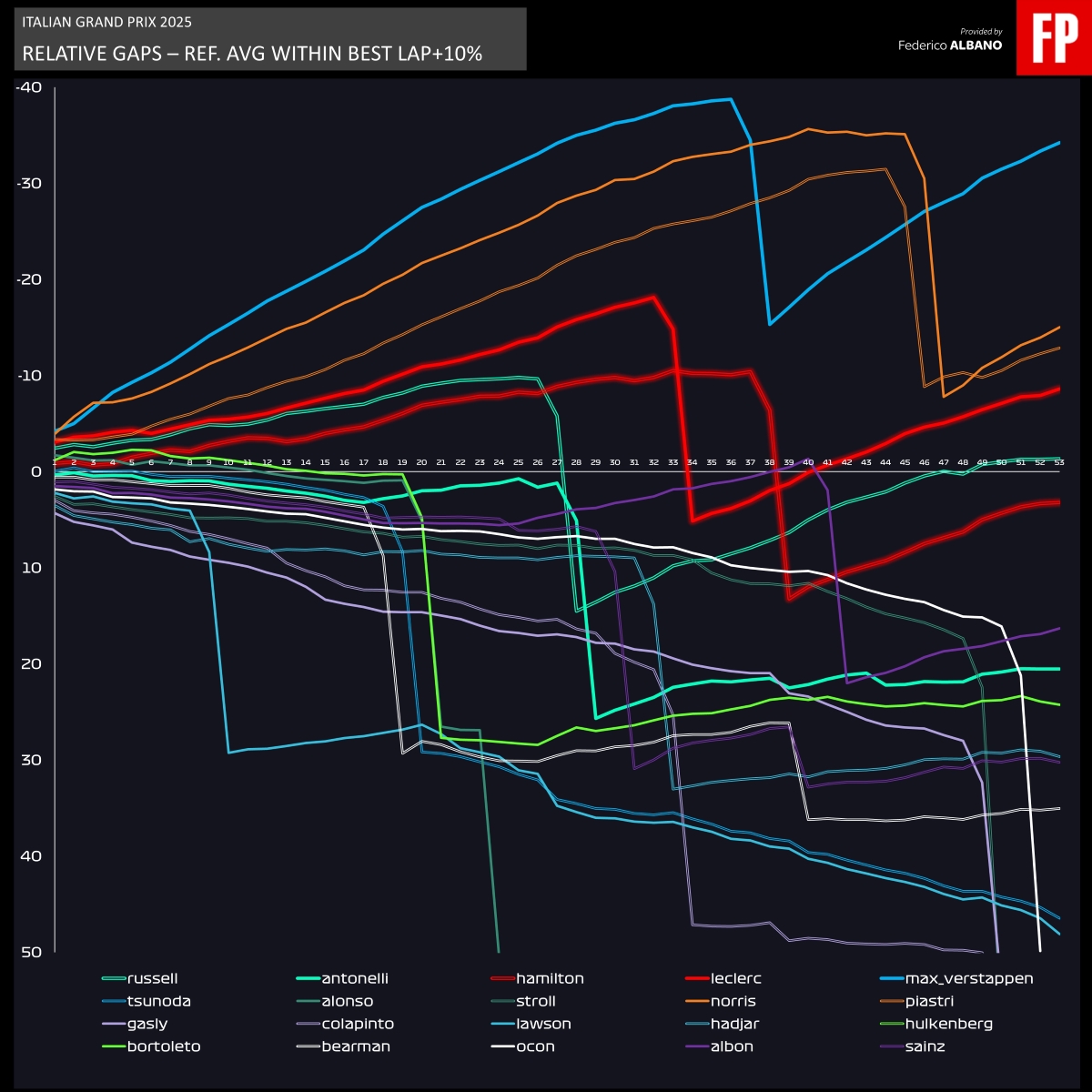 L’unico top team che si è distinto per una performance ancora peggiore della rossa è stato la Mercedes, con un Toto Wolff imbarazzato a sua volta dopo la gara, ma con una performance che non è una vera sorpresa: il team di Brackley non ha mai trovato una buona chiave di lettura per questa generazione di vetture, e la mancanza di fondamentali è emersa anche a Monza. La W16 continua a mostrare prestazioni generalmente insufficienti, con una stagione macchiata anche da una sospensione posteriore aggiornata che ha portato più danni che benefici. Russell è stato poi l’unico dei primi ad avere addirittura quasi un crollo sulle gomme medie, a conferma che, con le temperature più alte, gli anglotedeschi non trovano il modo di gestire le coperture. Nel complesso invece sufficiente la prestazione del weekend di Antonelli, anche se la gara non è stata pulita tra la brutta partenza e la penalità rimediata. L’italiano però è riuscito a concludere il Gran Premio a punti ed è comunque ciò di cui ha bisogno per trovare un po’ più di serenità. Davanti a lui è arrivato un ancora straordinario Alex Albon, perfetto sulla strategia e “martello” nel ritmo gara, mentre subito dietro hanno concluso Bortoleto, autore di un altro weekend di altissimo livello, e Hadjar, che ha trovato a sua volta una grande rimonta partendo dai box.