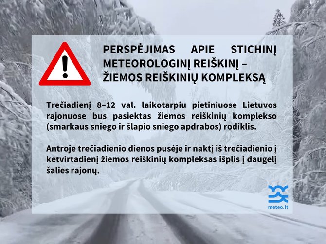 Kaip teigiama perspėjime, trečiadienį nuo 8 iki 12 val. pietiniuose Lietuvos rajonuose bus pasiektas žiemos reiškinių komplekso (smarkaus sniego ir šlapio sniego apdrabos) rodiklis.