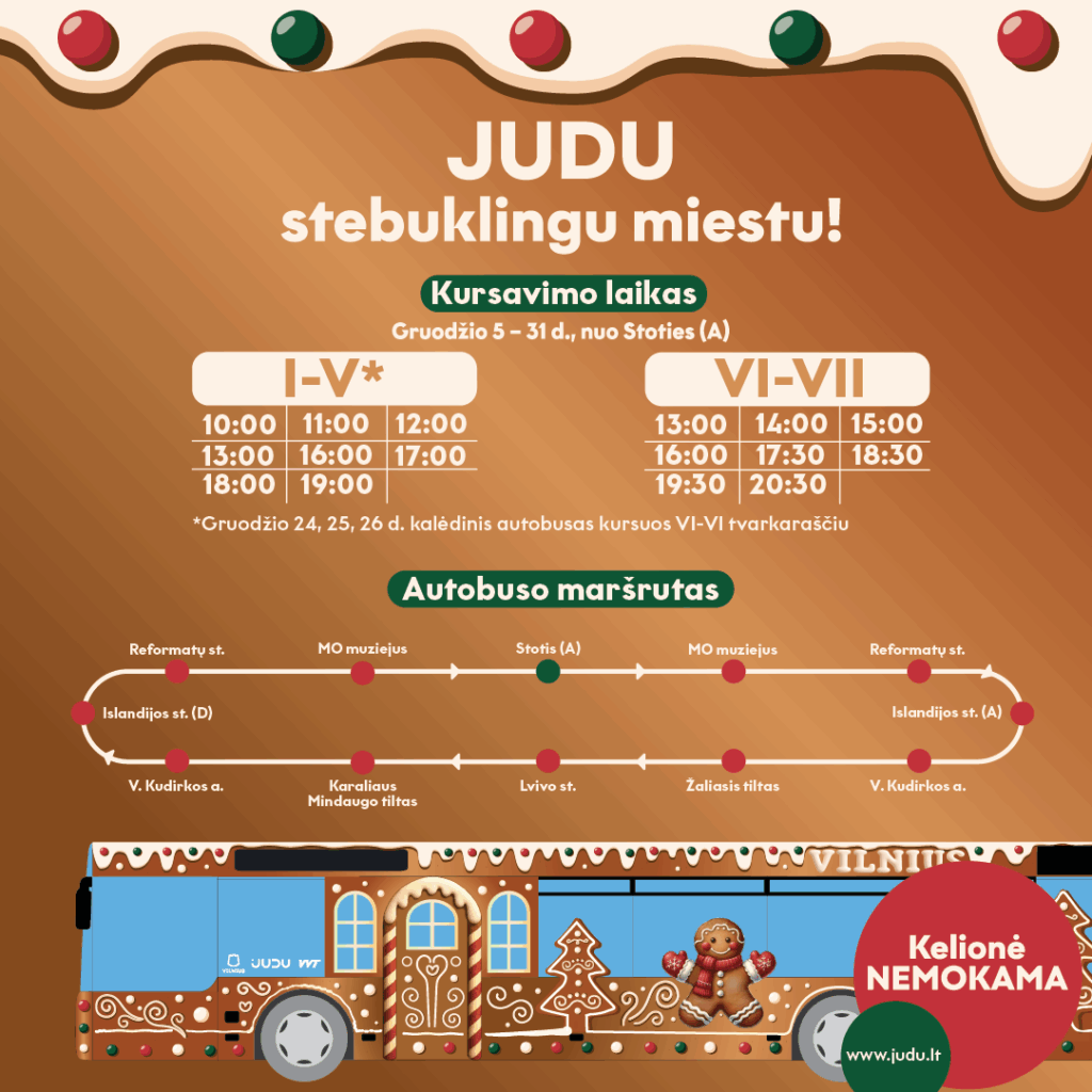 Vilnius pasiruošęs įžiebti dar daugiau šventinės nuotaikos – nuo gruodžio 5 d. į miesto gatves išriedės specialus Kalėdinis autobusas, kursuosiantis nemokamu maršrutu nuo stoties per miesto centrą. Šventinis maršrutas veiks kiekvieną dieną iki pat Naujųjų metų.
