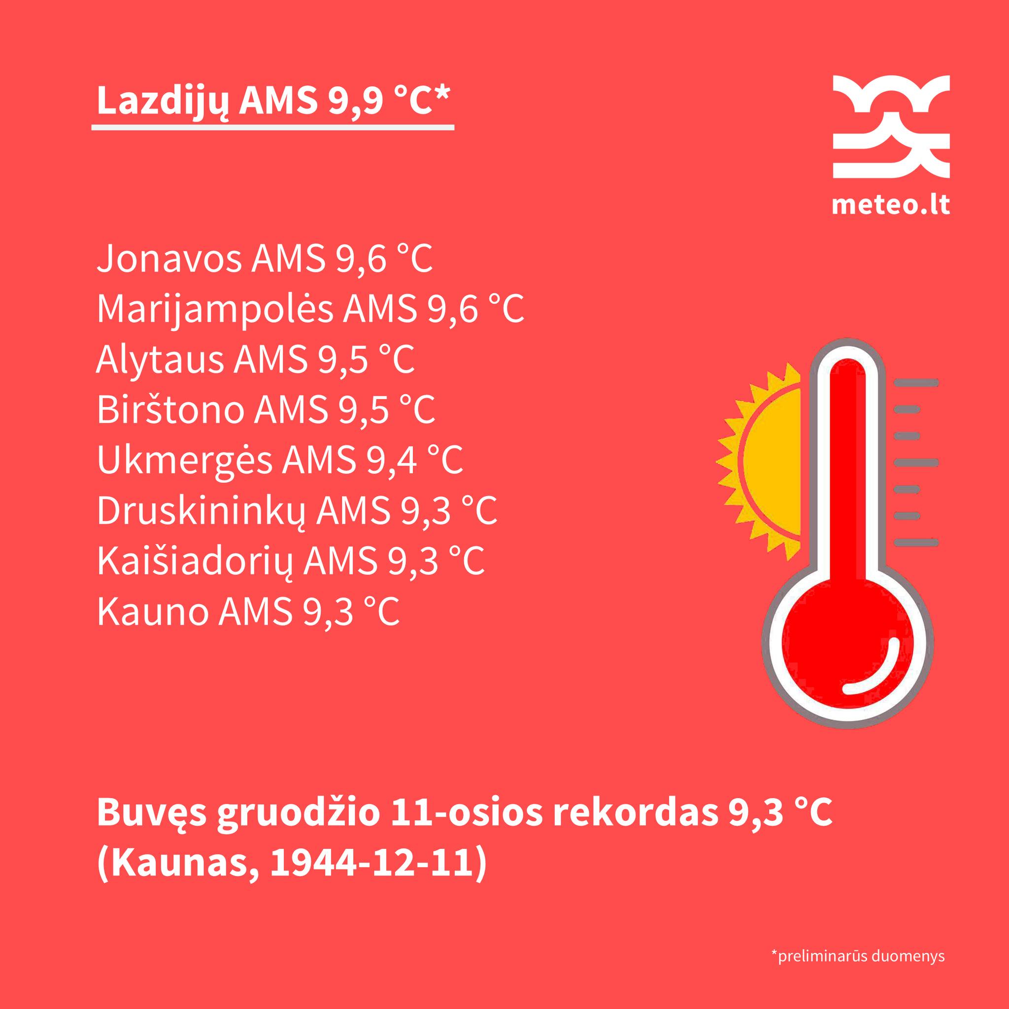 „Remiantis preliminariais duomenimis, buvo išmatuotas naujas gruodžio 11-osios aukščiausios oro temperatūros rekordas. Lazdijuose oras sušilo iki 9,9 °C. Ankstesnis šios dienos rekordas buvo užfiksuotas lygiai prieš 81 metus (1944-12-11) Kaune, kai temperatūra pakilo iki 9,3 °C (t. y. 0,6 laipsnio žemiau nei šiandien)”, – rašo tarnyba Facebook paskyroje.
