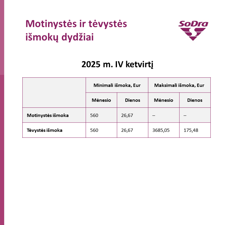 Minimali motinystės, tėvystės ir vaiko priežiūros išmokų riba yra lygi 8 bazinės socialinės išmokos dydžiams. Taip užtikrinama, kad motinystės, tėvystės, vaiko priežiūros išmokos būtų didesnės nei minimalių vartojimo poreikių dydis. Taigi, jei žmogus įgis teisę į motinystės, tėvystės arba vaiko priežiūros išmoką šių metų spalio, lapkričio arba gruodžio mėnesiais, minimali šių išmokų riba bus 560 eurų.