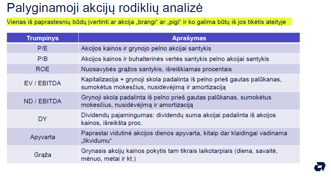 Pasakodamas, kaip atsirinkti individualias akcijas eiliniam gyventojui, fondų valdytojas pirštu bedė į palyginamąją akcijų rodiklių analizę (žr. žemiau pateiktą lentelę).