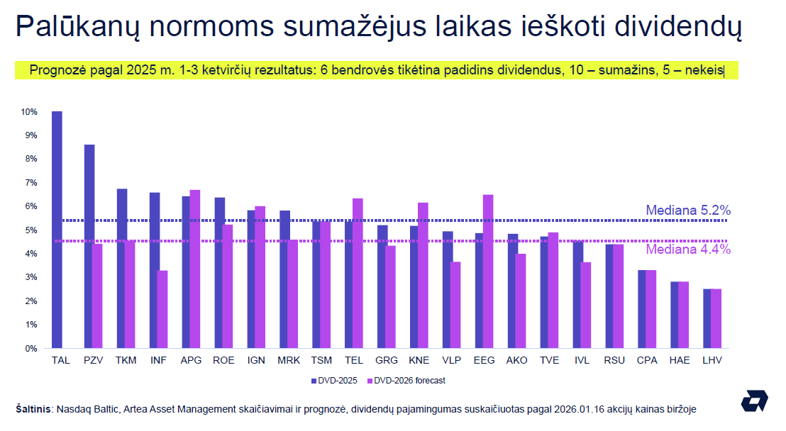 Rinkų ekspertas pasakoja, kad dividendų mediana, vertinant 2025 m. išmokėjimus, buvo daugiau negu 5%. Šiemet prognozuojama kiek mažesnė (4,4%), tačiau jis pažymėjo, kad tai labai pradinės prognozės ir labiau į konservatyvesnę pusę, realybėje gali būti geriau.