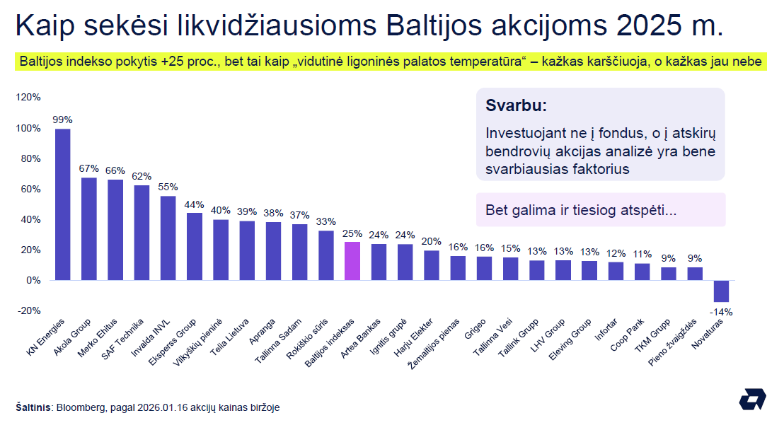 Žiūrint į pavienių likvidžiausių Baltijos biržos akcijų augimus, matyti, kad įmonėms pernai sekėsi neblogai.