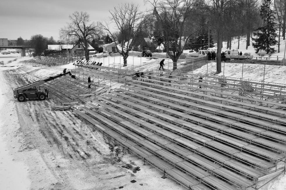 Kauno gatvės pusėje esančioje Nevėžio pakrantėje, ties Senamiesčio progimnazija, montuojamos žiūrovams skirtos tribūnos, talpinsiančios daugiau kaip 2 000 žmonių./Organizatorių nuotr.