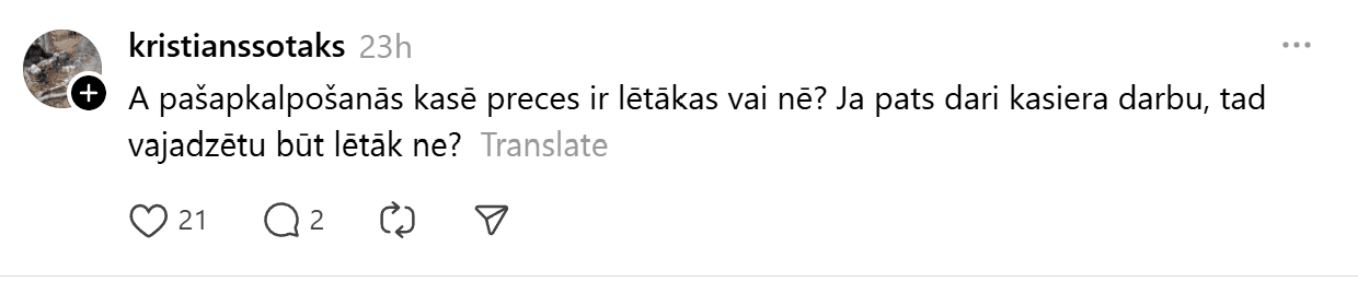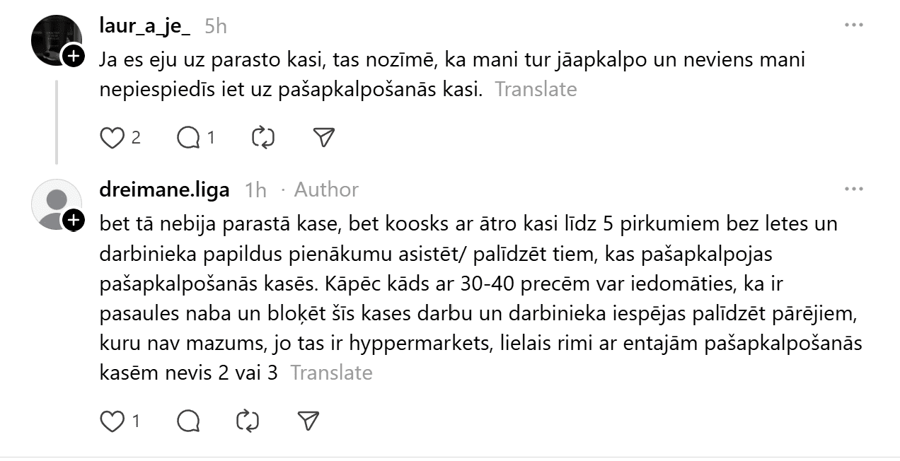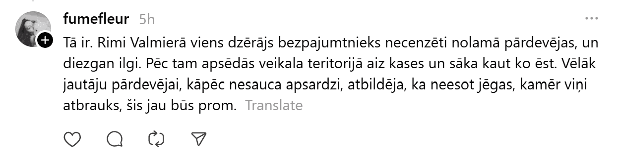 Platformā “Threads” sociālo tīklu lietotāju uzmanību piesaistījis kādas aculiecinieces ieraksts par nepatīkamu starpgadījumu, kas noticis pie “Rimi” kioska, kurā iespējams norēķināties par nelielu daudzumu preču. Tajā aprakstīta situācija, kurā kāds aptuveni 50 gadus vecs vīrietis skaļi terorizējis veikala darbinieci, draudējis un pazemojis viņu citu klientu priekšā.