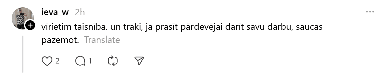 Šis gadījums aculieciniecei raisījis pārdomas par to, kāpēc lielajos tirdzniecības centros pārdevējai netiek nodrošināts vismaz viens apsardzes darbinieks, kas varētu novērst šādus incidentus, un kāpēc daļa sabiedrības joprojām attiecas ar nicinājumu pret pakalpojumu sniedzējiem.
