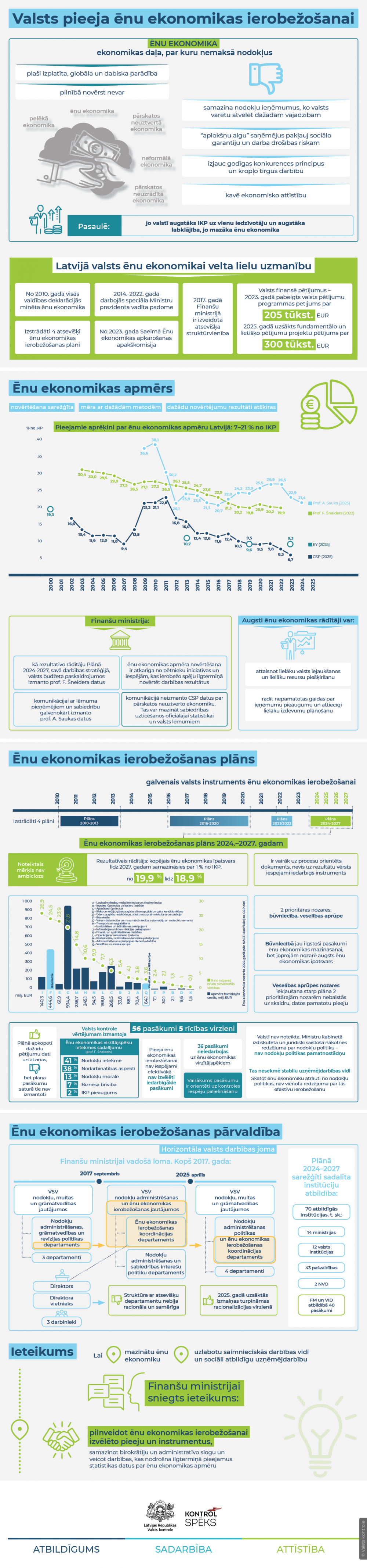 Latvijā ēnu ekonomikas ierobežošanas centrālais instruments ir Ēnu ekonomikas ierobežošanas plāns. 2024. gadā uzsākta jau ceturtā – Plāna 2024.–2027. gadam – īstenošana ar mērķi līdz 2027. gadam samazināt ēnu ekonomikas īpatsvaru no 19,9 % līdz 18,9 % no iekšzemes kopprodukta. Revīzijā secināts, ka izteikts uzlabojums netiek paredzēts.