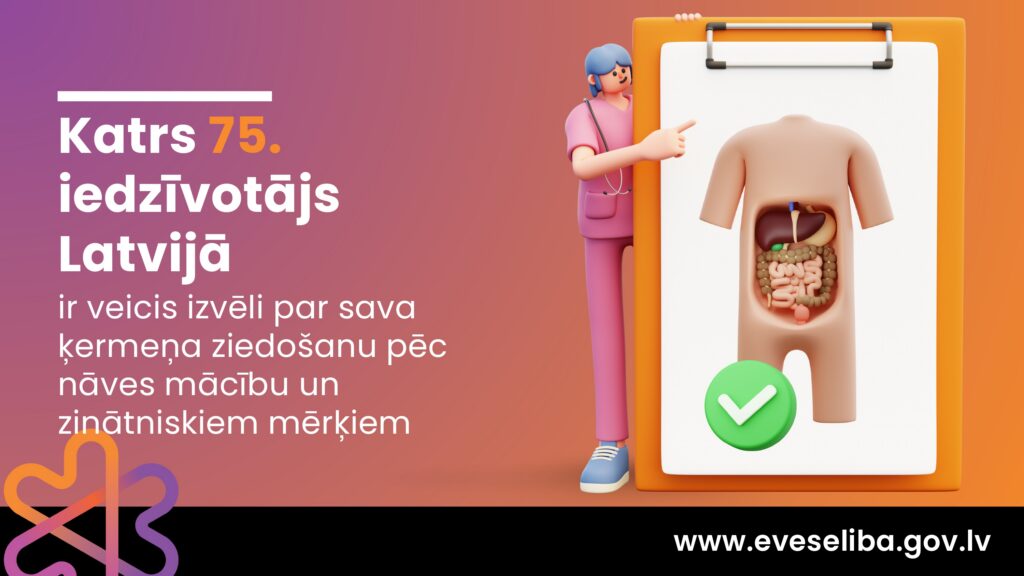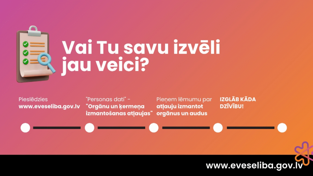 Ņemot vērā zemo Latvijas iedzīvotāju iesaisti ķermeņa, orgānu vai audu ziedošanā, LDVC aicina iedzīvotājus norādīt savu izvēli par ķermeņa, orgānu vai audu ziedošanu un veikt atbilstošu atzīmi valsts E-veselības sistēmas tīmekļvietnē www.eveseliba.gov.lv. Lai izteiktu savu gribu, ir nepieciešams autentificēties E-veselības sistēmā un izvēlēties sadaļu “Personas dati” – “Orgānu un ķermeņa izmantošanas atļaujas”. LDVC uzsver, ka veikto izvēli iedzīvotājs var mainīt jebkurā laikā.