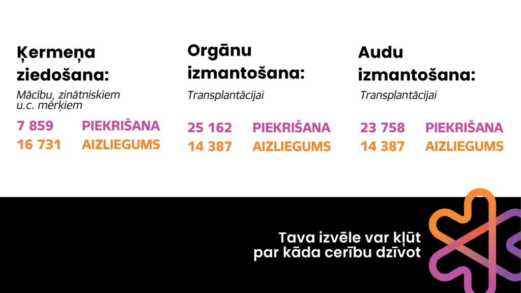 Līdz šī gada oktobrim atzīmi par atļauju vai aizliegumu par orgānu ziedošanu transplantēšanas nolūkam kopumā ir veikuši 39 549 iedzīvotāji, 65 % no tiem sniedzot savu piekrišanu. Izvēli par audu ziedošanu pēc nāves veikuši 38 145 iedzīvotāji, no kuriem 62% snieguši piekrišanu audu tālākai izmantošanai. Savukārt atzīmi par atļauju vai aizliegumu izmantot ķermeni mācību vai zinātniskiem mērķiem u.c. veikuši 24 590 iedzīvotāji, no kuriem vien trešdaļa devusi piekrišanu.