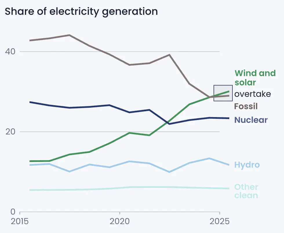 Tas iezīmē konkrētu pārmaiņu Eiropas enerģijas ražošanas resursos, kas pārslēdzās no ierastā kurināmā uz atjaunojamajiem resursiem. Īpašs izrāviens ir tieši saules enerģijas izmantošanā. 2025. gadā ar saules un vēja palīdzību tika saražoti 30% no kopējā patēriņa, bet ar fosilajiem kurināmajiem 29%. Protams, niecīga starpība, tomēr tā norāda uz izmaiņām.