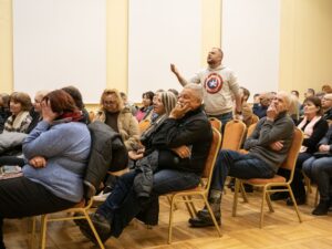 Gaisotne šķita saspringta, un iedzīvotāji ik pa laikam skaļi iesaucās: «Tukša runāšana!», kam sekoja jautājumu virkne. /Terēzes Matisones foto/