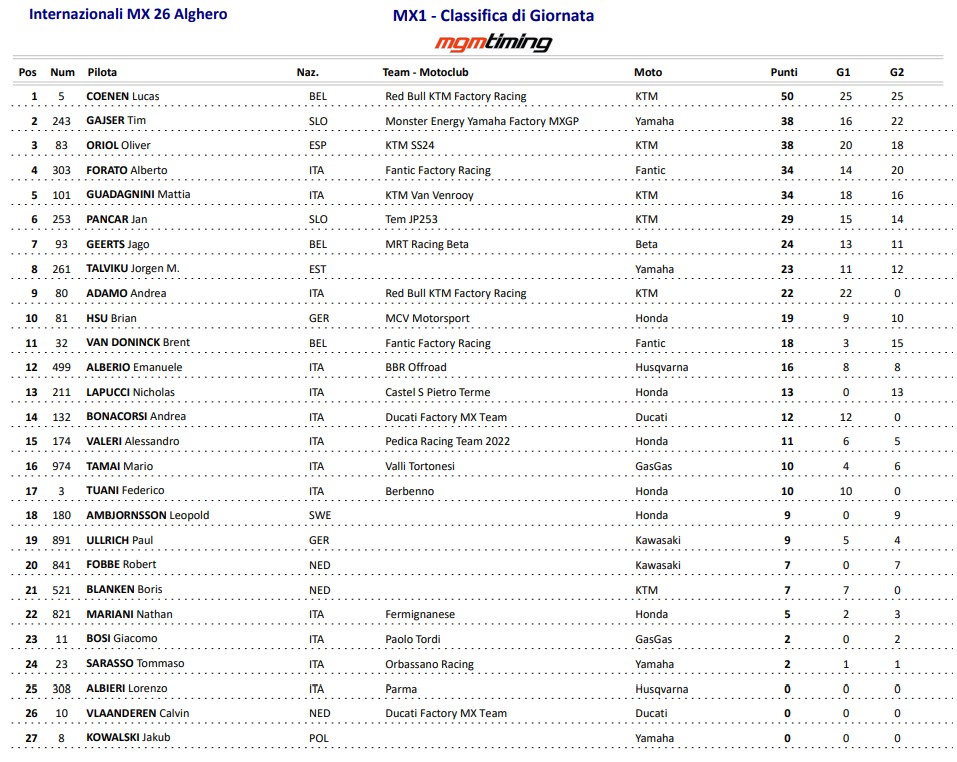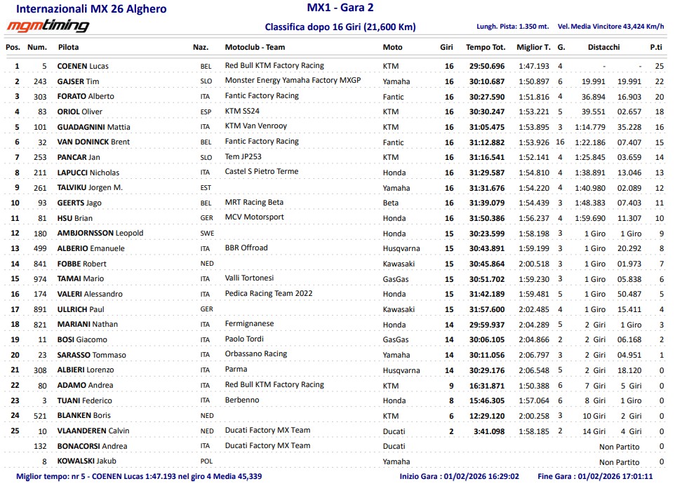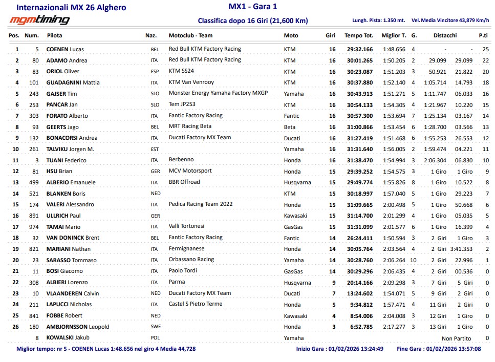 MX1 klasē dominēja pērnā gada MXGP vicečempions Lukass Kūnens, kurš abus braucienus aizvadīja kā izteikts līderis. Pirmajā braucienā viņš ātri pārņēma vadību un finišēja ar gandrīz 30 sekunžu pārsvaru pār tuvākajiem sekotājiem. Interesanta cīņa izvērtās starp citiem debitantiem un pieredzējušajiem braucējiem – “KTM” pārstāvis Andrea Adamo, kurš šogad debitēs MXGP, savās pirmajās sacīkstēs ar lielāko motociklu rādīja ļoti pārliecinošu sniegumu, taču tehniskas problēmas otrajā braucienā viņam lika izstāties no cīņas par pjedestālu.