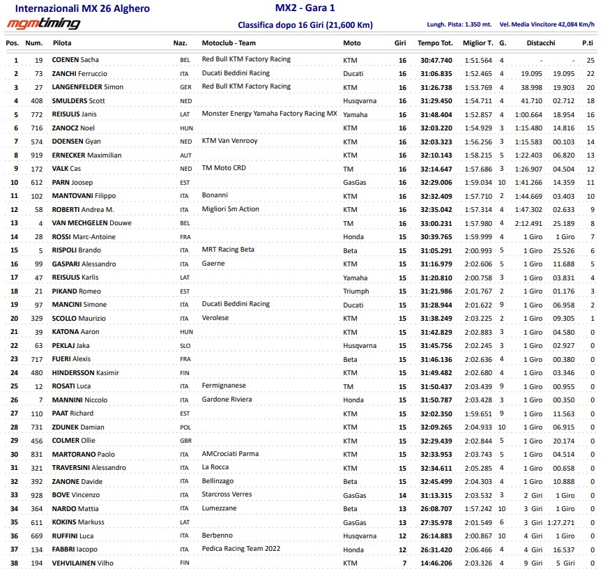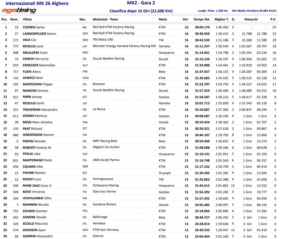 MX2 klases cīņas kopumā bija spraigas un neparedzamas. Pirmajā braucienā, kamēr J.Reišulis bija vadībā, S.Kūnens mēģināja atgūties pēc neveiksmīga starta un, lai gan viņš strauji tuvojās latvietim, tikai Reišuļa kritiens atviegloja Kūnena ceļu uz uzvaru. Tikmēr “Ducati” sastāvā debiju piedzīvoja Feručio Dzanki, kurš izcīnīja otro vietu pirmajā braucienā, bet kopvērtējumā kāpa uz pjedestāla zemākā pakāpiena.