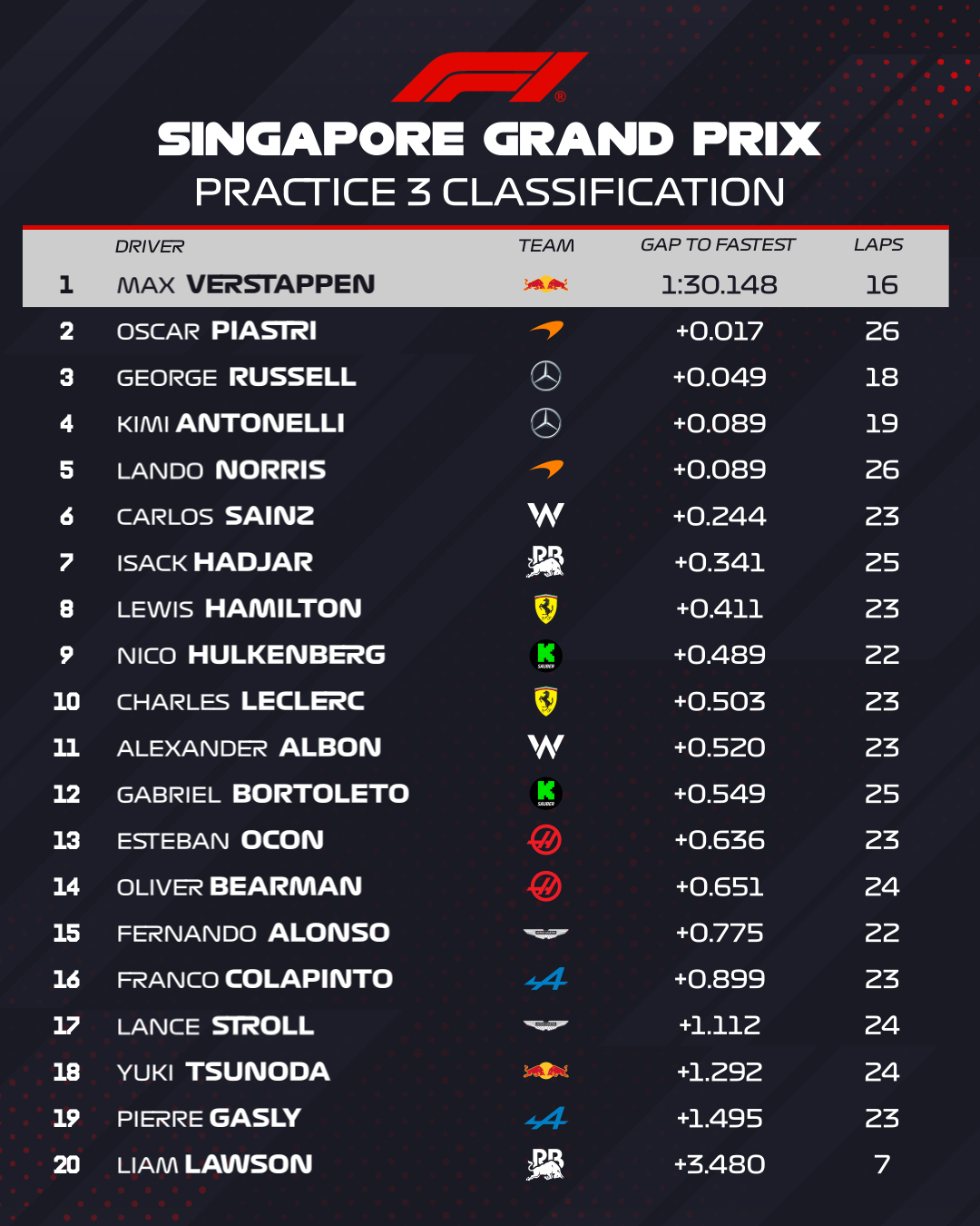 Verstapens ar rezultātu 1:30.148 šoreiz bija ātrākais, liekot saviem faniem cerēt, ka arī Singapūras ielās viņš būs spējīgs cīnīties par uzvaru. Tomēr četrkārtējā F1 čempiona pārsvars pār tuvākajiem sekotājiem bija niecīgs. “Mercedes” un “McLaren” vienību braucēji zaudēja mazāk par 0.1 sekundi. Oskars Piastri un Džordžs Rasels bija tuvākie sekotāji, ceturtajā un piektajā vietā ierindojās Kimi Antonelli un Lando Noriss.