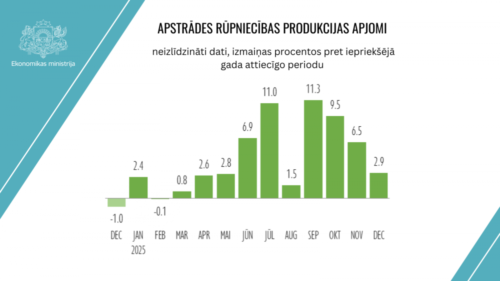 2025.gada decembrī, salīdzinot ar 2024.gada decembri, pēc neizlīdzinātiem datiem apstrādes rūpniecības produkcijas apjomi pieauga par 2,9%. Savukārt pēc kalendāri izlīdzinātiem datiem izlaide pieauga mērenāk – par 0,4%.
